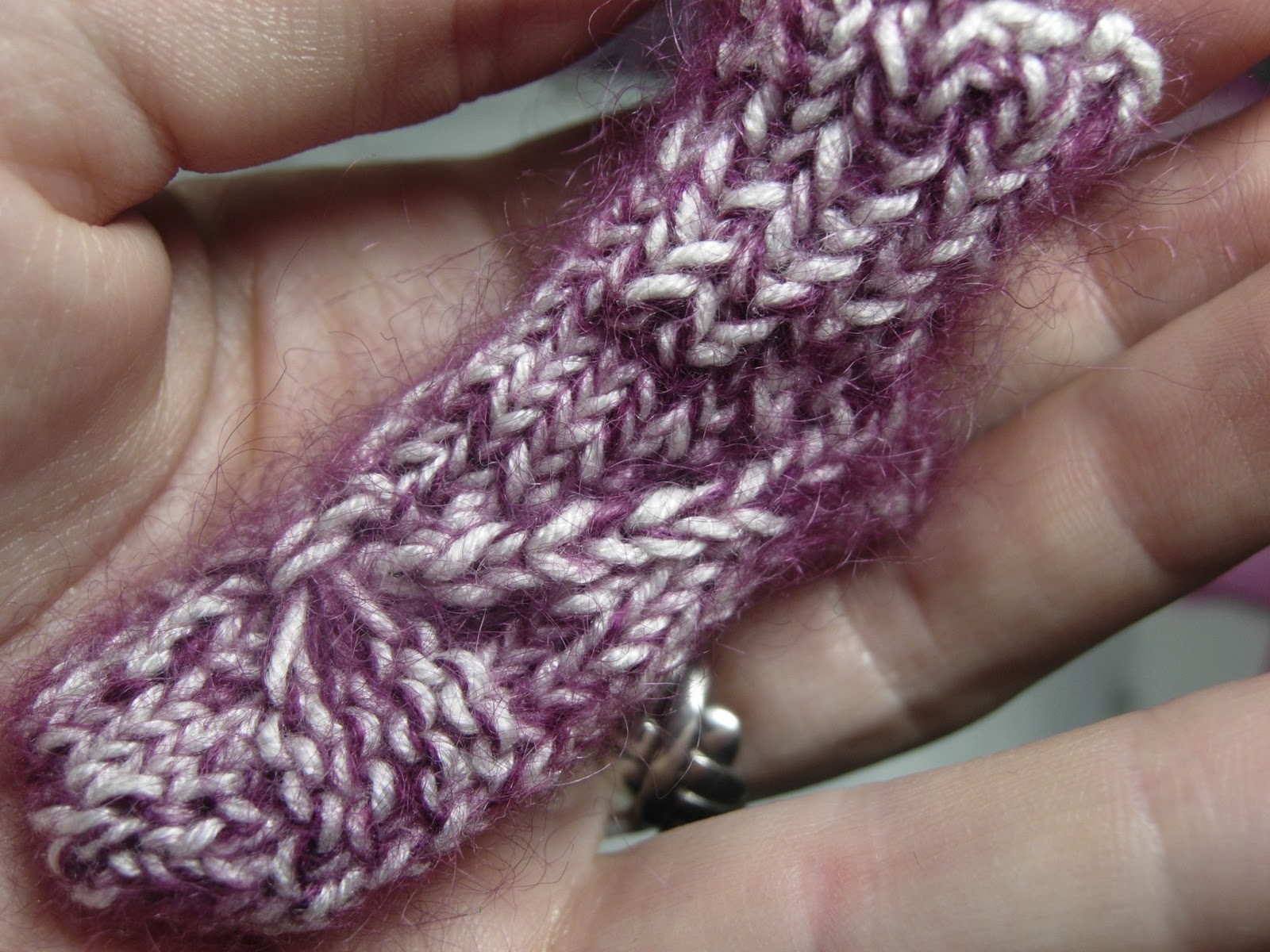 On to the socks! These are similar to yesterday's, but I only used two colors instead of three. It's hard to see in the pictures, but yesterday's had two lace weight yarns, on is the main one you see, the dark...burgundy? The other is a pale lilac color (I made some tinies out of it a while ago...they're the ones that don't look like socks). Today I only used the burgundy and the cream colored bamboo. The lilac stuff is on a huge cone and makes it difficult to travel with.